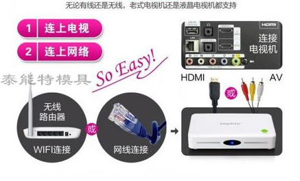 关于网络电视机顶盒怎么安装?如何用?网上有一大堆方法推荐,但是都说的太繁杂了,让人看得很头痛,这次,泰能特塑胶模具厂给大家分享就非常简单有效,因为泰能特模具本身就是做机顶盒外壳的大型厂商。其实网络电视机顶盒的安装方法和普通的DVD安装方法没有什么太大区别,就是多了一条网线,闲话不说,你自己往下看。